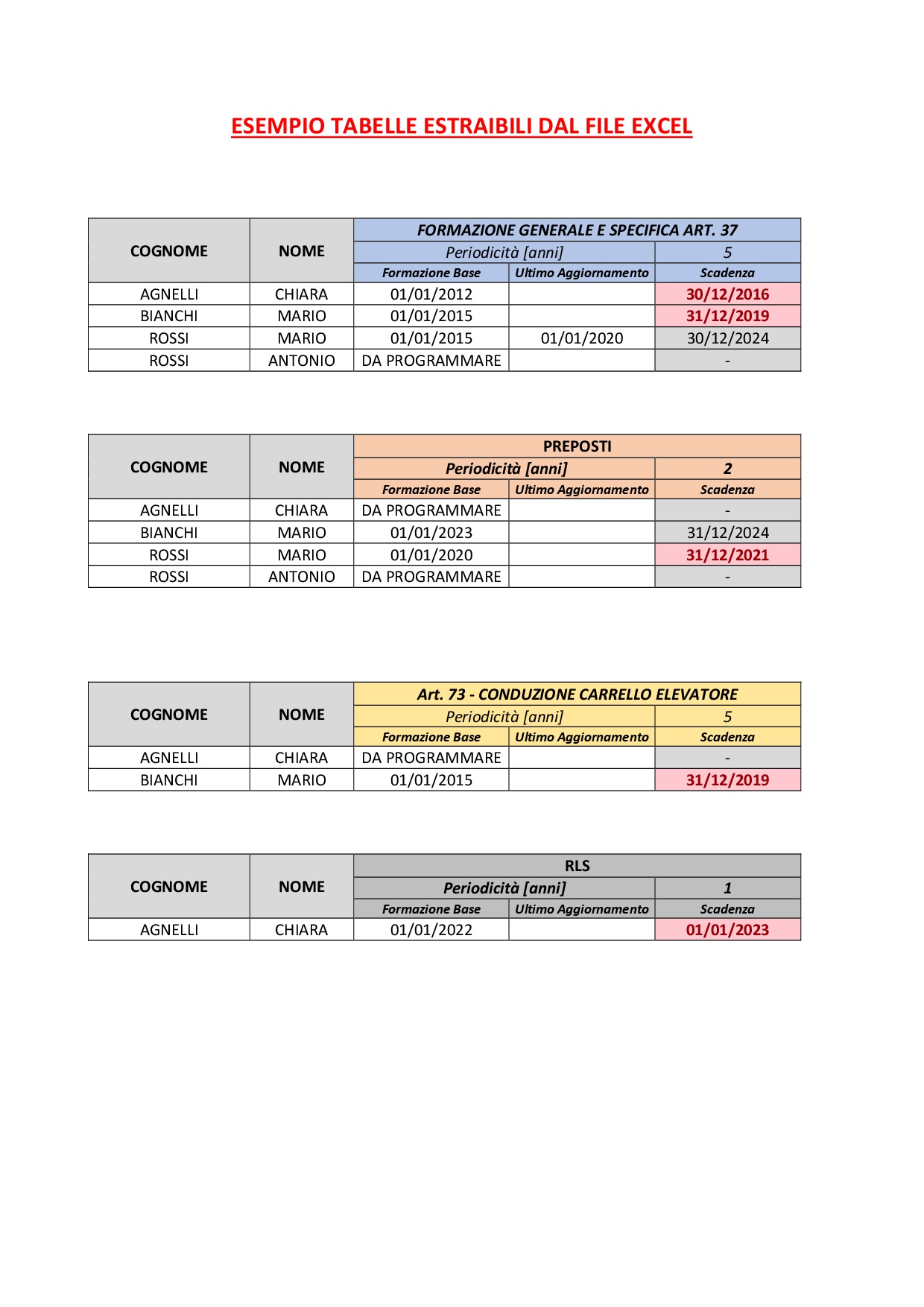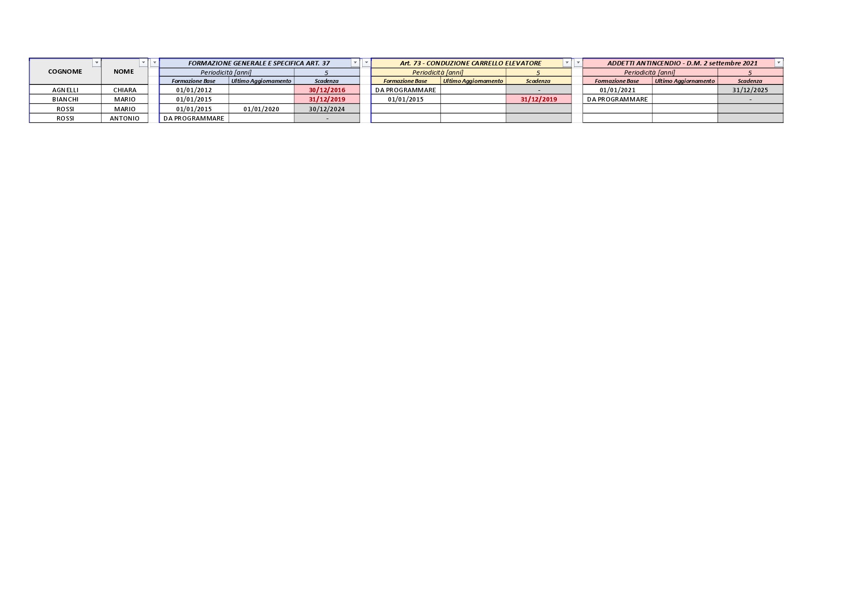 Cartella di lavoro “Excel” che gestisce l’anagrafica dei lavoratori e automatizza le scadenze relative ai corsi di formazione in materia di salute e sicurezza, quali ad esempio: