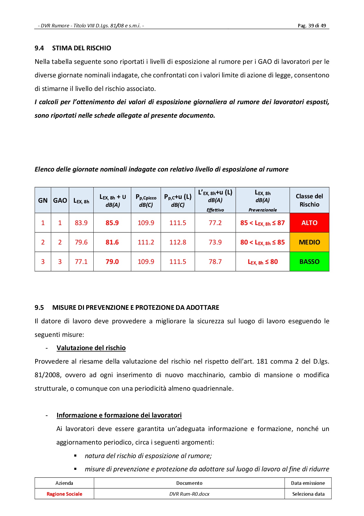 - classificazione del rischio per ogni Gruppo Acusticamente Omogeneo individuato