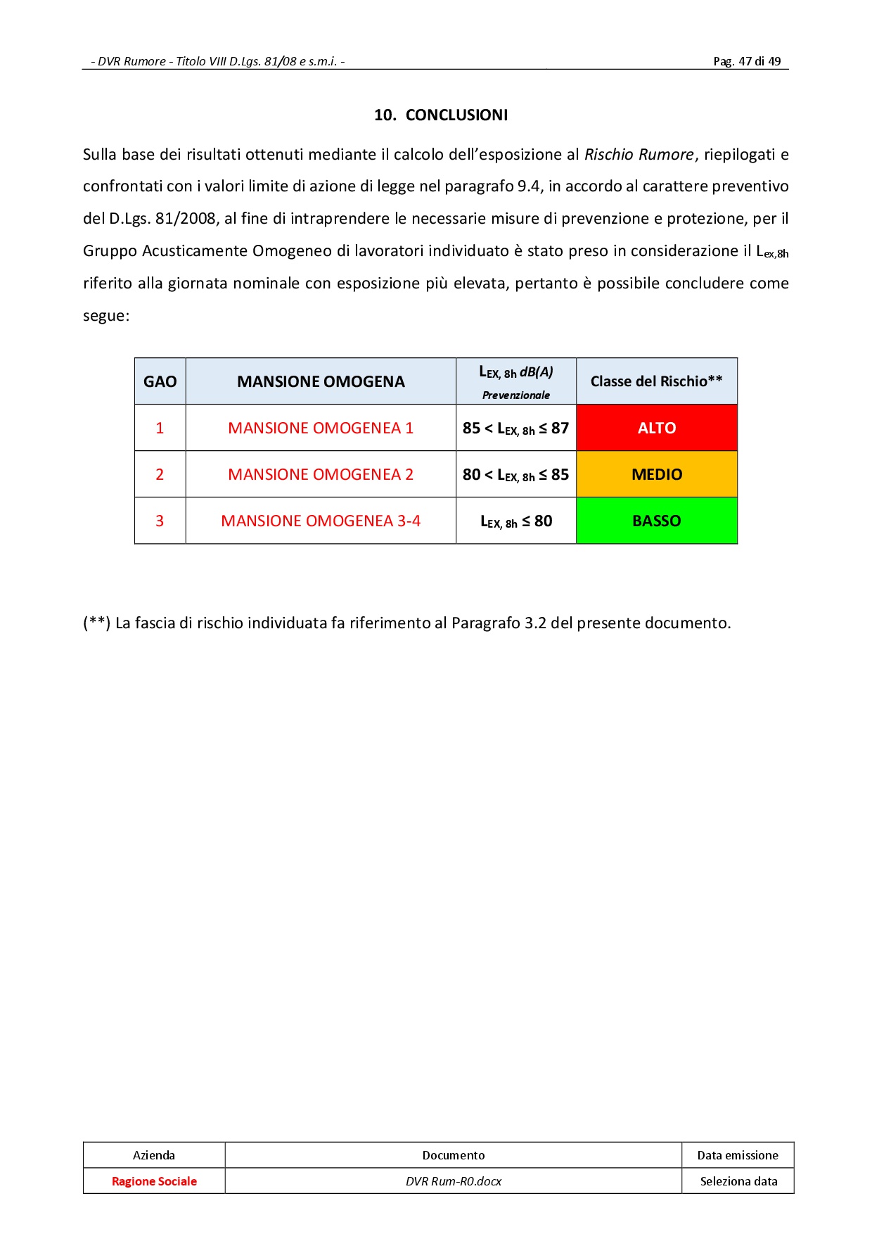 I livelli di esposizione sonora calcolati permettono la classificazione finale del rischio per ogni Gruppo Acusticamente Omogeneo di lavoratori attraverso un confronto con i livelli di azione definiti dal D.Lgs. 81/08 e s.m.i.