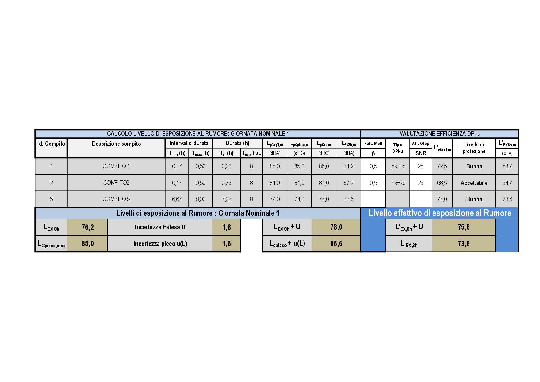 - Calcolare per ogni giornata nominale il Livello di esposizione giornaliera al rumore, LEX,8h, il livello sonoro di picco, definire i DPI-u necessari per la protezione dei lavoratori, quindi verificarne l’adeguatezza con il metodo SNR e determinare il Livello di esposizione giornaliera al rumore ottenuto tenendo conto dell’attenuazione, L'EX,8h.